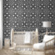 The graphic style draws inspiration from traditional Islamic art, known for its symmetrical and repetitive motifs. The monochromatic colour palette—stark black shapes against a clean white background—lends a modern and versatile appeal. This contrast not only emphasizes the complexity of the design but also allows for easy coordination with various interior colour schemes.
