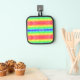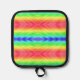 A square, multicolored pot holder with a vibrant, symmetrical rainbow pattern and a black border. Back: Solid black textured fabric with a loop.