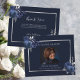 A simple and elegant sympathy thank you card with photo. A navy blue background, a faux silver frame and blue florals. Personalise and add your thank you note.