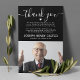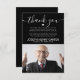 Modern funeral thank you card featuring a treasured photo of your beloved one, a black background that can be changed to any color, the words "thank you" in a elegant calligraphy script font, a personalized appreciation message, their name, and dates.