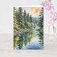 A tranquil forest scene features a river mirroring tall pine trees beneath a sky adorned with orange clouds in a watercolor style.
