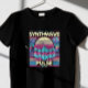 vintage-style t-shirt design featuring a retro sunset with layered sun rays, palm trees, and a beach silhouette, along with the phrase "synth wave pulse" 🌅🌴✨