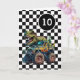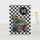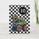 A dinosaur monster truck 10th birthday card for boys. Featuring a black and white chequered background on the front with a place you can easily personalise the age if needed. A Tyrannosaurus rex on top of a monster truck will delight all dinosaur and monster truck fans.