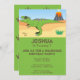 A fun birthday party invitation with a dinosaur theme. The design features a fierce T-Rex in an arid landscape with a distant erupting volcano. The Tyrannosaurus is green with purple markings. All wording can be fully personalised with the details of your child's seventh birthday party. The theme is tied together with a dinosaur footprint pattern on the reverse of the invite.