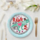 Paper plates with an image of a green t-rex wearing a black top hat with hearts and flowers all around. Text says Rawr means I love you in t-rex.
