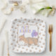 These PARTY ASAURUS cute dinosaur birthday party paper plates will add a little extra fun to your dino décor. A background pattern of brown dinosaur tracks sets the theme for a middle square with a tan and peach T-Rex in a party hat and colourful letters spelling out PARTY ASAURUS, making these large square paper plates great for any age. Designed to be gender neutral, the colour palette of browns, tans, peach, blues and purples makes these cute dinosaur paper plates appropriate for both boys and girls.