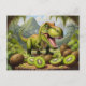 This is an AI generated image. I wish the T-Rex's face was closer to the fruit but, I liked the mountain in the background so I chose this image to put on a postcard.