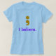 For those of you not beholden to the sway of every shiny object that looks your way, this is your shirt. Believe in the power of the semicolon; use it; use it and stave off the dark semicolon-less ages that those against its use would have us stumble backwards into, blindly groping for some stolid grammatical device to use when the clauses you are joining are not of similar cloth enough to warrant the invocation of a comma, nor of disparate enough aim to necessitate the forcible separation of their spacial and temporal existence by the use of a period. You have used the semicolon with pride and satisfaction; you plan to continue with glee and stern resolve; moreover, to those who would say they "do not believe in the semicolon," you say that it is not a matter of belief but a matter of reality, for the existence of the semicolon is incontrovertible; however, since these self-described "non-believers" wish to frame the discourse in terms of this patently illegitimate dichotomy between belief and disbelief in the semicolon, you stand up proudly and yawp barbarically to the heavens your utter and undying belief in them and all they represent. The battle lines are drawn; your lot is cast. You raise your pen; you make your mark. Oh yeah, and you wear it on your shirt, too.