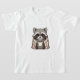 This heartwarming artwork features an adorable grey raccoon sitting comfortably while wrapped snugly in a beige and red plaid blanket. The charming woodland character holds a simple white mug with steam rising from it, suggesting a hot drink like coffee or cocoa. With large, glossy eyes, distinct facial markings, and cute paws peeking out, this design captures the essence of warmth and relaxation against a clean background.
