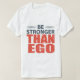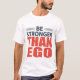 This design features a motivational phrase, "BE STRONGER THAN EGO," prominently displayed in bold, uppercase text. The phrase uses contrasting colours: "BE STRONGER" in dark blue and "THAN EGO" in vibrant orange-red. The typography style is bold and rugged, with slight distressing or texture in the orange-red text, adding a vintage or dynamic feel. Horizontal lines above and below "BE" give the design a balanced look. The overall layout emphasizes strength and determination, making it suitable for fitness or self-improvement-themed t-shirts.