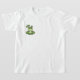 An adorable cartoon frog sitting cross-legged on a large green water lily leaf. The happy amphibian character wears a small golden crown and holds a steaming white coffee cup with both hands. The design features a cheerful expression with pink cheeks, set against a clean background with tall leaf stems behind it, creating a relaxing pond atmosphere.