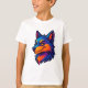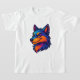 The fur is rendered with dynamic, angular strokes in a vivid gradient of blue, purple, orange, red, and yellow, creating a sense of depth, energy, and motion. The inner ears are highlighted with warm tones, while cooler shades dominate the top and back of the head, offering strong colour contrast and visual appeal.