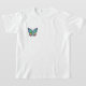 This playful and edgy artwork features a bright blue butterfly with vibrant, gradient wings fading from blue to green, yellow, and pink. Despite its adorable appearance—complete with heart-tipped antennae and large, sparkling eyes filled with star-shaped glints—the character is gripping a large silver kitchen knife with a determined grip. The design contrasts the innocent, colorful beauty of a butterfly with a humorous touch of danger, all rendered in a clean, bold cartoon style.