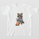 This adorable artwork features a cheerful raccoon enjoying a cozy moment by the campfire. The woodland character is dressed in a grey hooded sweatshirt with a small flame logo on the chest, adding a modern, casual touch to its furry appearance. Standing upright with a friendly smile and bright eyes, the raccoon holds a stick with a large, golden-brown toasted marshmallow hovering over the vibrant orange and yellow flames of a small log fire. The illustration captures the warmth of a camping trip with clean lines, expressive details, and the classic ringed tail visible behind the character.