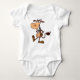 This white baby garment showcases a stylish cartoon bull strutting confidently with one hand on his hip and a playful smirk. He’s accessorised with sunglasses and a silver belt buckle, giving him a cool, laid-back vibe — a fun and funky design for little trendsetters.