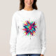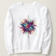 A bold and vibrant white sweatshirt featuring an abstract starburst design. The artwork showcases a central pink circle surrounded by jagged, dynamic shapes in bright colors such as blue, yellow, pink, and black. Radiating outward like an energetic explosion, the composition is accented with small dots and lines that add movement and depth. The striking contrast between the vivid design and the clean white fabric makes this sweatshirt a standout piece, perfect for those who love expressive and eye-catching fashion.