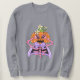 The man is wearing a light grey crewneck sweatshirt. The shirt features a large, colourful, and cute Halloween graphic in the centre. The graphic depicts a skeleton with a pink and purple ribcage, wearing a cape and a large purple bow, and topped with a carved jack-o'-lantern head adorned with a green stem hat and white flowers.