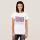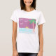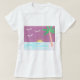 This basic white T-Shirt is designed with a setting sun, blue ocean, palm tree, and a magenta sky.