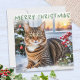 This festive Christmas card features a picture of a cute tabby cat sitting outside its house on a snowy afternoon, with winter plants and berries. With 'Merry Christmas' greeting at the top, the card is a plain white on the reverse side for your own message.