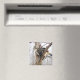 This square magnet features a tabby or tiger cat standing in a tree guarding her property.