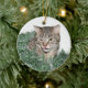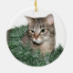 Tabby cat in Christmas garland decoration photo Christmas ornament. Similar photo on each side, one with mouth closed and the other side with the tongue out
