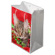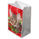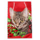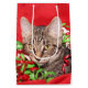 Cute young tabby kitty cat has found the Christmas decorations and is playing with them, having great fun in doing so, cat lovers Christmas holiday gift bag