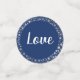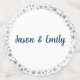 These table confetti pieces are a mix of rich Sapphire Blue and White, double sided with well-wishing comments for the bride and groom. Graphics of petite Silver-Grey coloured stars grace both front and back around the edges. Simple, yet elegant design. Sample texts are "Jason & Emily", "congrats", "Happiness"."Together As One", "Love", "Forever". Customise this item or buy as designed.