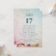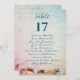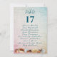 Table seating chart cards that list the guests at each table. A seashell border at the bottom, over a blue - pink fade graphic background, with sea blue number and text. List names with corresponding table number to hang at the reception. All text will print on both sides. Place in a stand on reception tables. Guests can peruse the cards and then find their table. The design is perfect for any seacoast, wedding, or event. The design can be customised and downloaded to print out yourself, or choose a paper type and order to be printed.