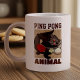 A speciality mug for a table tennis master, featuring a funny cartoon of a sporty binturong bearcat doing a ping pong forehand smash. Use "Personalise this template" to change the "PING PONG ANIMAL" text and make a unique customised gift. Text changes are reflected on both sides. It's a ping pong binturong!