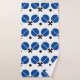 Table tennis ping-pong rackets and ball black, blue custom tennis table bathroom towel set showcasing a minimalist pictogram icon of blua and black table tennis rackets and ball. The hand towel includes a striped pattern in blue, black and white and the washcloth is of solid blue colour.