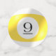 In the 19th century a poolroom was a horse race betting parlour. Pool tables were installed so the bettors could pass time between horse races. Billards, or pool, is the descendant of a game similar to croquet that was played in 15th-century Europe. Though we don't know for sure, it is strongly suspected that billiards came to America with Dutch and English settlers. By the 1700's, skilled cabinet makers were crafting beautiful tables, though the equipment was, otherwise, quite primitive. Fifteen-ball pool came on the scene in the late 1800's and grew in popularity through the 1940's. Billiards was revived in 1961 with the release of the movie THE HUSTLER. It enjoyed another surge in the mid 1980's with the release of the movie sequel, COLOR OF MONEY. Since that time, there has been an evolution of the environs in which we find pool tables -- they're in restaurants and night clubs and sports bars, allowing pool to find a modern audience and new generations of enthusiasts. This marvellous design features the bold, yellow-striped NINE ball . . . making this tablefetti an excellent choice for 9th birthdays, anniversaries . . . or any other noteable ninth. The reverse is a coordinating solid yellow featuring text you may personalise to your special "ninth" event.