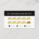 This chic taco/mexican restaurant/food truck loyalty card features a black chalkboard background with a taco. Personalize it for your needs. You can find matching products at my store.