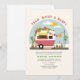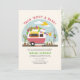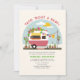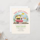 Taco themed neutral baby shower with illustration of hot pink and white retro vintage camper trailer taco truck with baby clothes hanging on clothesline connected to birch tree under a blue sky with sun and clouds. text says "Taco Bout A Baby!" Camper is decorated with balloon garland, pampas, cactus, papel picado, and plants in terra cotta pots.