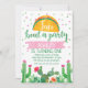 Looking for a girl's fiesta or cactus themed birthday invitation? This birthday invitation may be what you're looking for and is suitable for various ages. The design features a taco, cactus, succulents and pink banner on a white background. This design is particularly suitable for a first or second birthday.