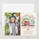 "Taco Bout A Grad" graduation theme featuring illustration of taco cream truck camper with cactus and papel picado. Personalise the photo at left.