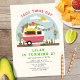 Taco themed "taco twosday" birthday party invitation with illustration of hot pink and white retro vintage camper trailer taco truck with string of papel picado connected to birch tree under a blue sky with sun and clouds. Camper is decorated with balloon garland, pampas, cactus, and plants in terra cotta pots.