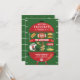 A red kettle bbq grill with all the goodies for your tailgate party. Barbecue and football items include: hot dog, hamburger, corn, helmet, yard lines, banners, ketchup, beer bottle, fork & knife. The back of the card features a football field.