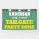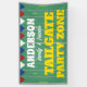 Tailgate party banner with your custom name and Tailgate Party Zone. Edit all text or change it to your team colours. Red white and blue patriotic pennants at the top can be deleted if not needed. Football field background in green.