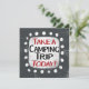 "Take a Camping Trip Today" is a cute text design in grey with black and red text. It sits on a white accent shape and cute white polka dots surrounding it.