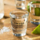 Black and white typography design wedding keepsake favours for your wedding. Shot glass that reads - Take a shot we tied the knot. Customise with your names and wedding date.