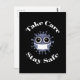 Take care and stay safe typography with an illustration of a grey masked Corona Virus in the centre.