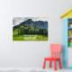 This poster features a picture of a mountain in northern Italy with a pine forest on a cloudy summer day.
