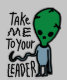 "Unleash your sense of humour with our 'Take Me to Your Leader' design, featuring a cute alien and a sarcastic quote. This playful and witty artwork
