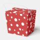 Party favour box shown in a cute takeout style in a cute red and white polka dots print.