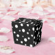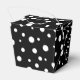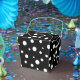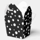Party favour box shown in a cute takeout style in a cute black and white polka dots print.
