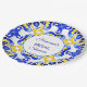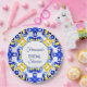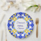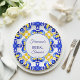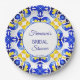Talavera azulejo blue yellow tiles vintage Mexican bridal shower monogram printed paper plates template, Mediterranean Italian blue tile pattern Maiolica blue tiles Greek tiles pattern bridal shower personalised tableware table decor