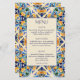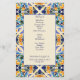 Blue and brown colourful vintage Mexican talavera azulejo tiles wedding menu cards, handwriting casual font colourful talavera tiles vintage ornaments menu cards