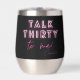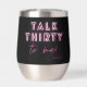 Talk THIRTY To Me 30th Birthday Party Neon Pink Thermal Wine Tumbler features a modern pink neon text "Talk Thirty to me!" in modern calligraphy script on a black background. Personalised with your custom name. Designed by Evco Studio www.zazzle.com/store/evcostudio