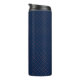 Tall blue travel mug with a black lid, featuring an orange geometric pattern of intersecting lines and dots. The design is modern and sleek.