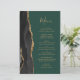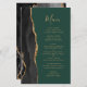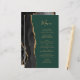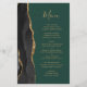 The left-hand edge of this elegant modern wedding menu features a black watercolor agate border trimmed with faux gold glitter. The customisable text combines gold-coloured handwriting script and copperplate fonts on a dark emerald green background. The reverse side features a matching black and gold agate design.